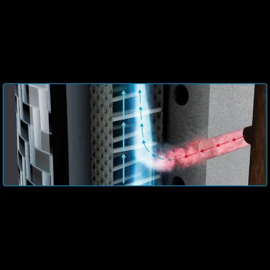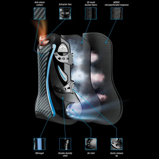 Die Gamasche Carbon Gel Vento von Veredus ist die erste Springgamasche, die eine doppelte Belüftung gewährleistet. Die vom Pferdebein ausgeströmte Wärme durchquert die Schicht aus mikrogelochtem Neopren und verteilt sich dann im kanalisierten Mesh-Gewebe 3D. Die Frischluft tritt durch den Lufteinlass ein, versetzt die im kanalisierten Gewebe aufgefangene Wärme in Bewegung und leitet sie nach oben zum Auslassgitter. Die Belüftung erfolgt somit sowohl horizontal - von innen nach außen - als auch vertikal - von unten nach oben. Eine innovative Technologie, welche eine optimale Belüftung gewährleistet. Im Weiteren wird der Schutz der Beugesehne durch Carbon, das mit einem stoßdämpfenden Film aus Nitrex-Gel verbunden ist, optimiert. Die anatomische Form der Schale und die Knopfverschlüsse geben der Gamasche einen sicheren Halt am Pferdefuß.