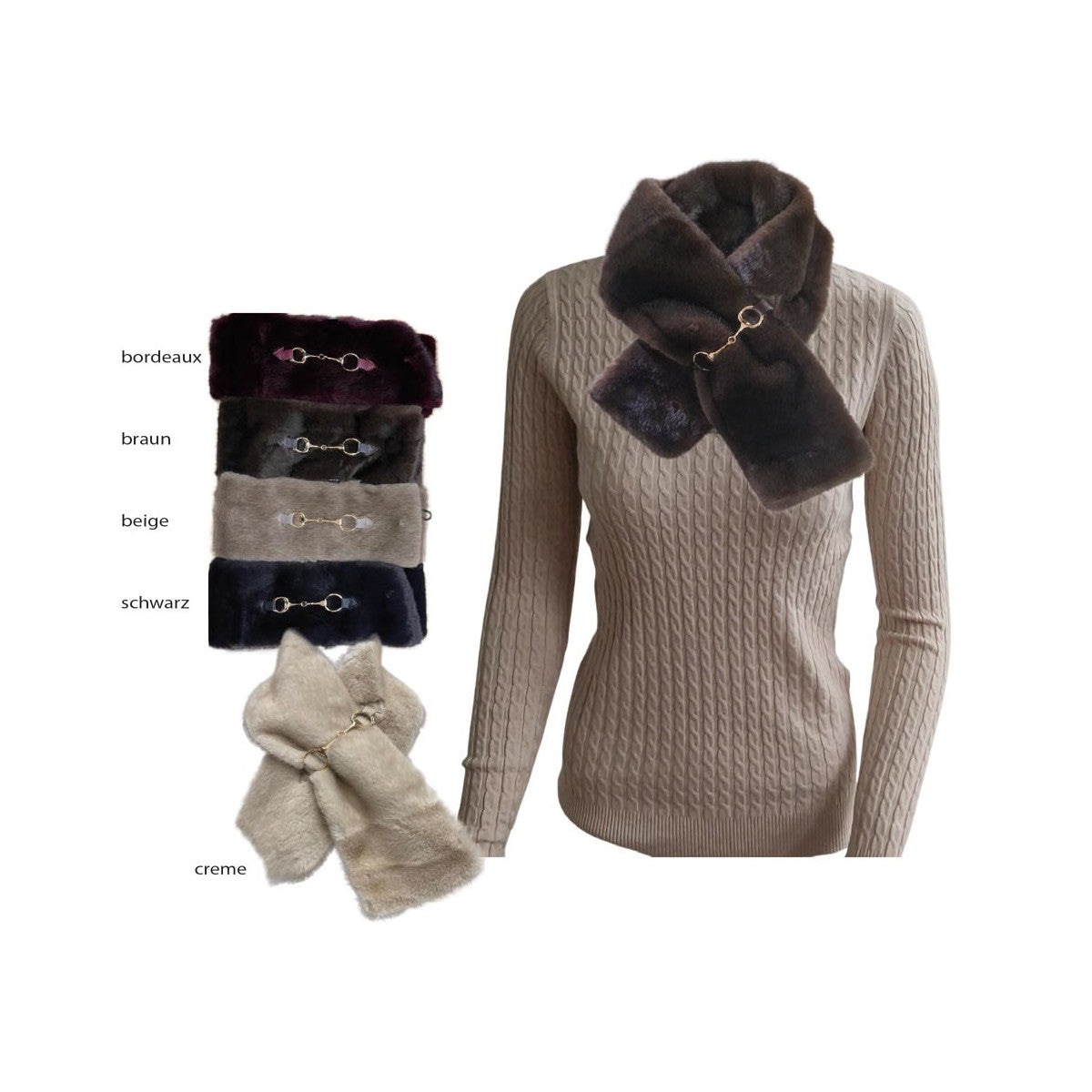 Neu im Sortiment sind die schicken Fellschals mit einem kleinen Pferdegebiß (gold) als Verschluß. Die Schals sind aus Polyester und sehr weich und angenehm. Ein auffälliges Accessoires für Dein Outfit.