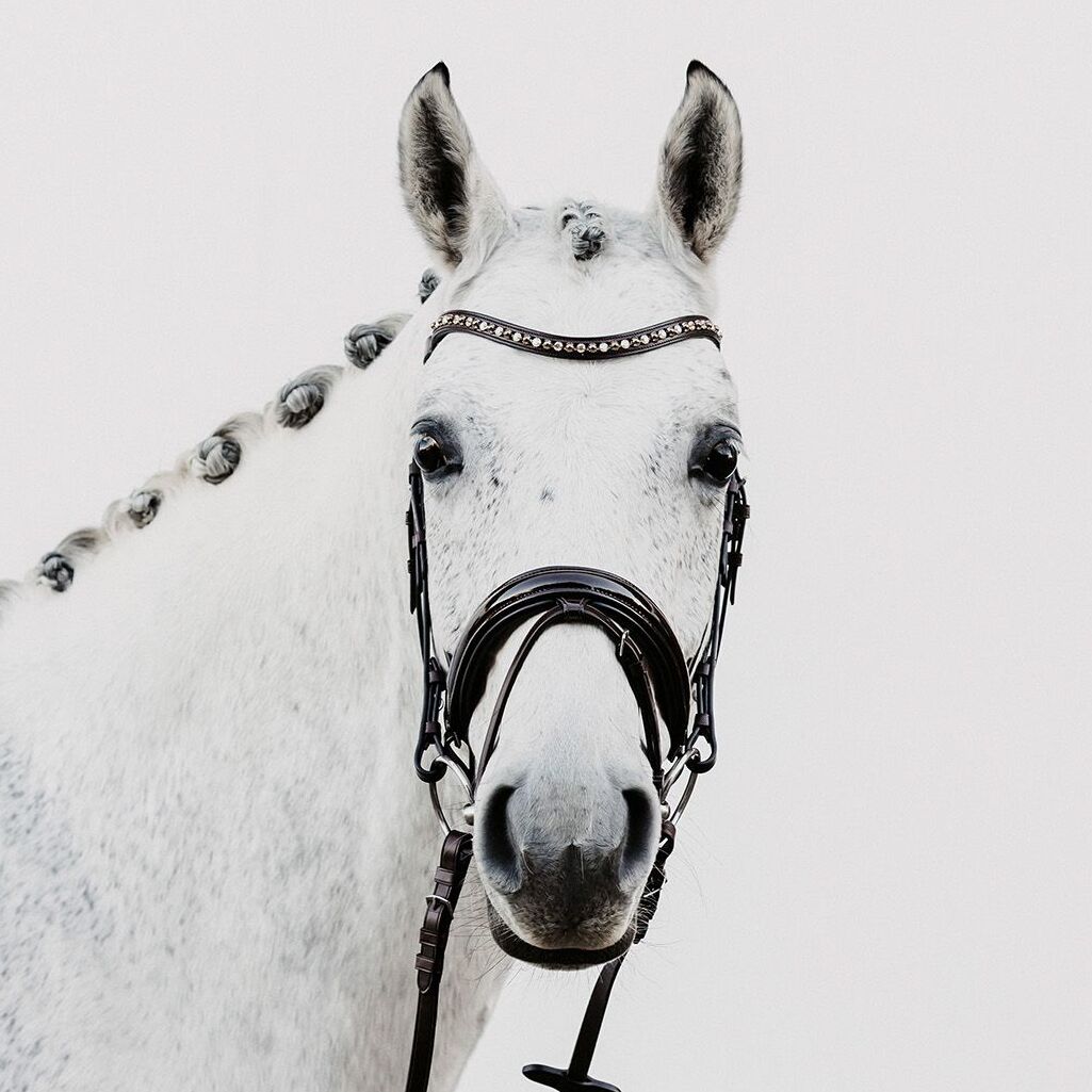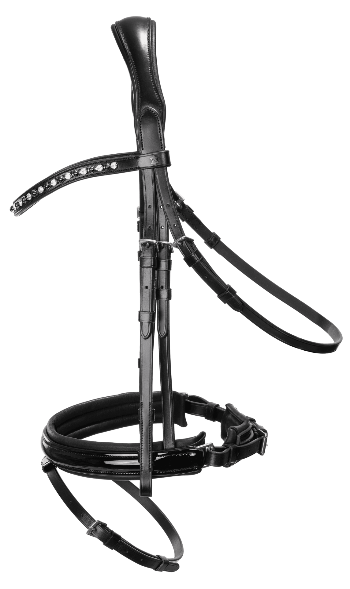 Das Design besticht durch Eleganz und Liebe zum Detail: Das glänzende Lack-Reithalfter, die fein geschwungenen Stirnbänder mit funkelnden Glitzersteinen und edlen Perlen schaffen einen unvergleichlichen Look.