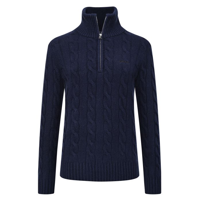 Der HVP-Dunya Pullover ist ein absolutes Must-have für alle, die Eleganz und Funktionalität miteinander verbinden möchten. Dieses luxuriöse Kabelstrick-Design verleiht jedem Outfit das gewisse Extra und wird dich auf jedem Reitturnier zum Blickfang machen. Der halbe Reißverschluss und das hochgeschlossene Kragen-Design bieten dir nicht nur einen modernen Look, sondern auch angenehme Wärme an kühleren Tagen. Das elegante Lurex-Sticklogo auf der Brust und das metallische Pferdegebiss am unteren Saum zeugen von deiner Liebe zum Pferdesport und setzen stilvolle Akzente.