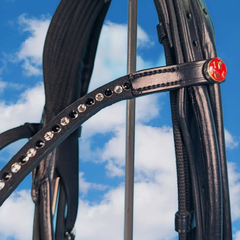 Durch die rundgenähten Elemente, das konisch geformte Reithalfter und das dezent funkelnde Stirnband mit ® Crystals wirkt dieser Trensenzaum sehr edel am Pferdekopf. Sylvie II ist wahlweise mit oder ohne Lackleder in schwarz oder weiß unterlegt sowie zwei verschiedenen -Stirnbändern erhältlich.
