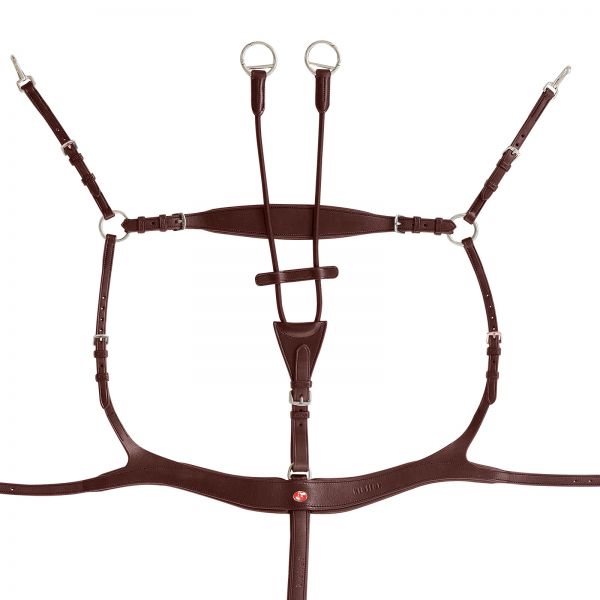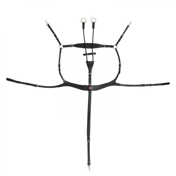 Das sportliche 5-Punkt-Vorderzeug Palmanova ist aus bestem Qualitätsleder gefertigt und mit vielen praktischen Features ausgestattet. Der Brustriemen mit anatomischer Halsausformung sowie Widerrist- und Bauchriemen sind weich gepolstert und auf optimalen Halt und Druckverteilung ausgelegt. Die herausnehmbare Martingalgabel mit runden Elastikbändern für eine sanftere Einwirkung lässt sich dank Ringkarabinern schnell und unkompliziert am Zügel befestigen. Mit Hilfe des integrierten Lederschiebers lassen sich die Ringabstände an der Martingalgabel flexibel einstellen.