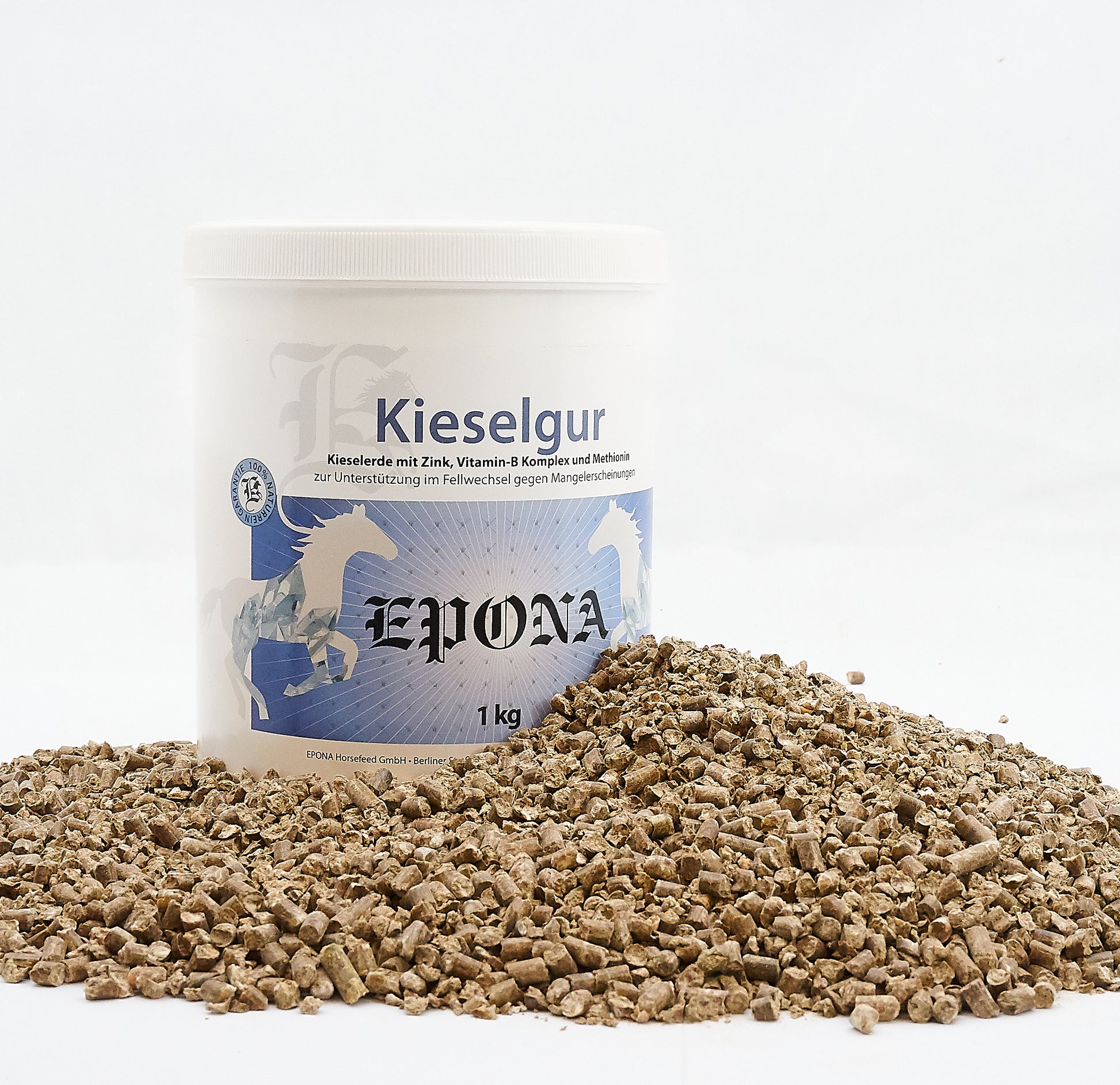 Kieselerde, der essentielle Eiweißbaustein Methionin, Zink, sowie die Vitamine A, D3, E, B1, B2, und B6 für glänzendes Fell und top Hufe. EPONA Kieselgur ist unsere Empfehlung insbesondere auch im Fellwechsel oder bei fütterungsbedingten Mangelsituationen.