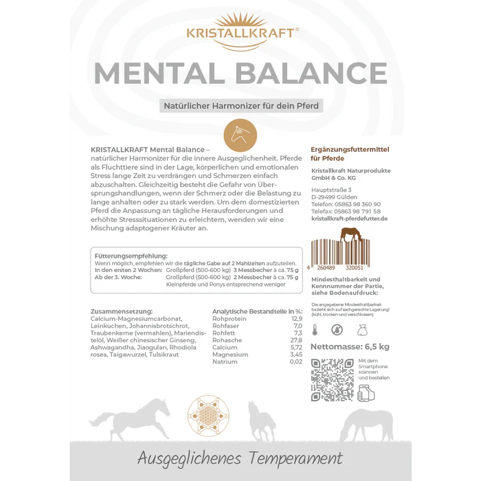 Mental Balance kann sowohl temporär während einer stressigen Zeit oder auch als Dauergabe gegeben werden. Bitte beachte, dass Stress und Nervosität meistens auch mit Magenproblemen einher gehen. Daher hat ich die Kombination mit Kristallkraft Coolly bewährt. Wenn du dir unsicher bist, ob du die richtige Menge fütterst oder sonst noch Fragen hast, ruf einfach an und lass dich persönlich beraten: 05863 98 360 90
