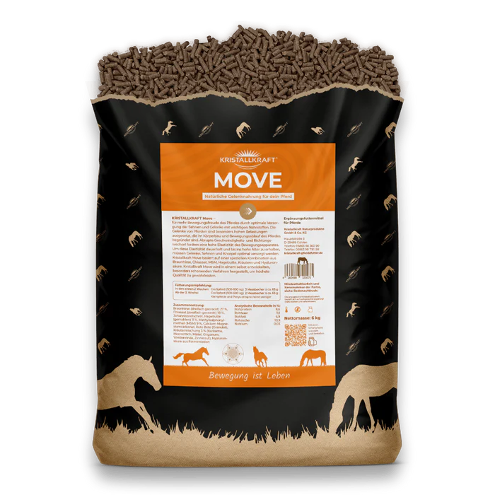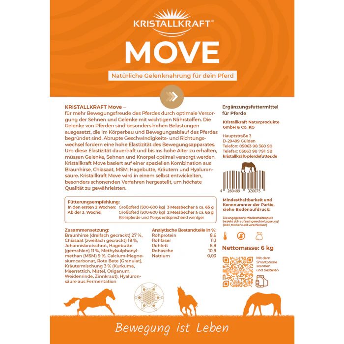 Sind die Gelenke intakt und gut geschmiert, die Sehnen elastisch und der Knorpel belastbar, sinkt auch das Unfallrisiko. Mit zunehmendem Alter steigt das Risiko von Gelenkproblemen. Wie bei uns Menschen lässt die Elastizität des Bindegewebes nach, die Gleitfähigkeit der Gelenkflüssigkeit (Synovia) schwindet und die Bewegungsfreude unserer Pferde lässt nach. Kristallkraft Move basiert auf einer speziellen Kombination aus siliziumreicher Braunhirse, Chiasaat, MSM, Hagebutte, Kräutern und Hyaluronsäure. Durch unser selbst entwickeltes, besonders schonendes Herstellungsverfahren können wir höchste Qualität gewährleisten.