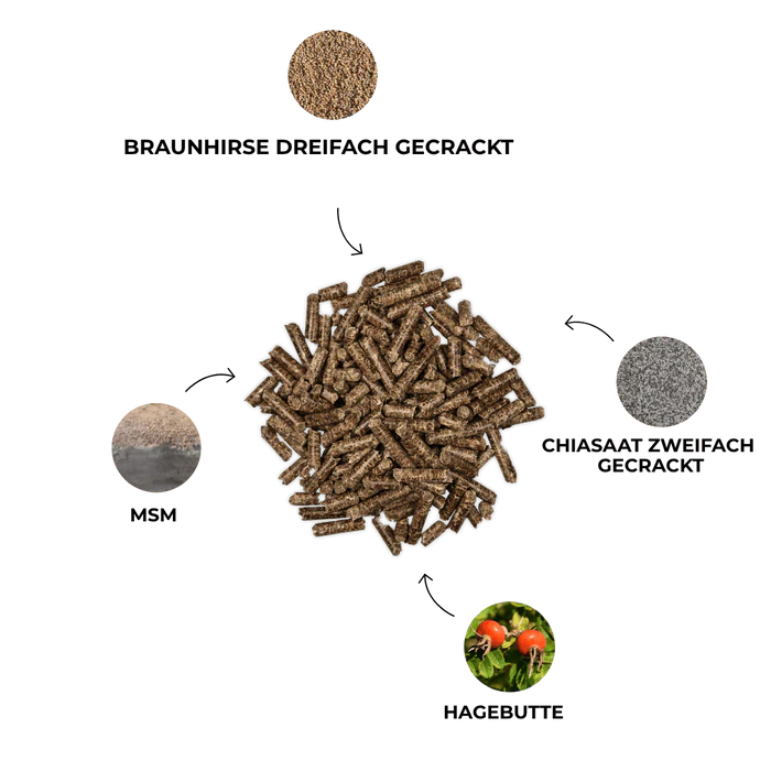 Braunhirse (dreifach gecrackt) 27%, Chiasaat (zweifach gecrackt) 18%, Johannisbrotschrot, Hagebutte (gemahlen) 11%, Methylsulphonylmethan (MSM) 9%, Calcium-Magnesiumcarbonat, Rote Beete (Granulat), Kräutermischung 3% Kurkuma, Meerrettich, Mistel, Origanum, Weidenrinde, Zinnkraut), Hyaluronsäure aus Fermentation