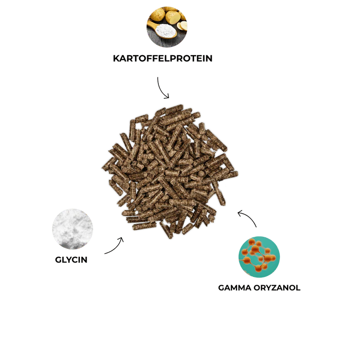 Kartoffel-Protein 33%, Leinkuchen, Johannisbrotschrot, Glycin, Reiskeimöl, Gamma-Oryzanol 2%