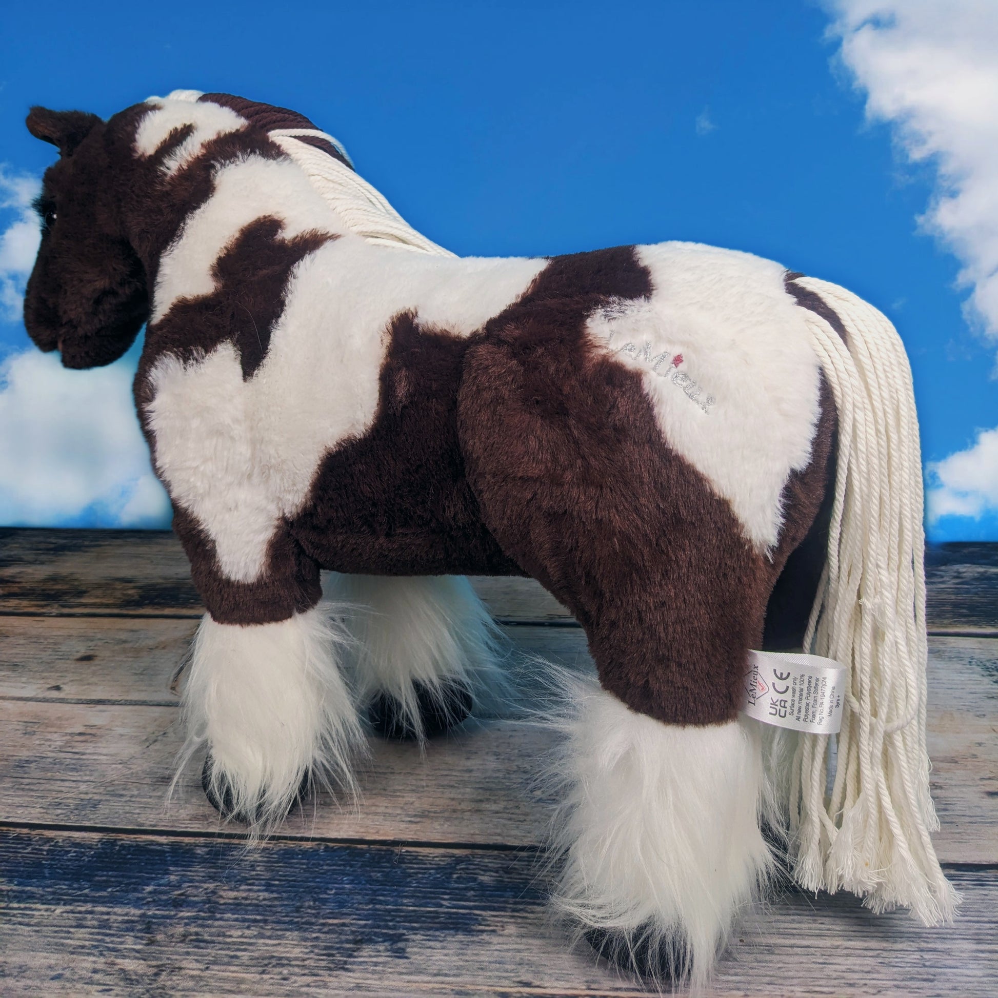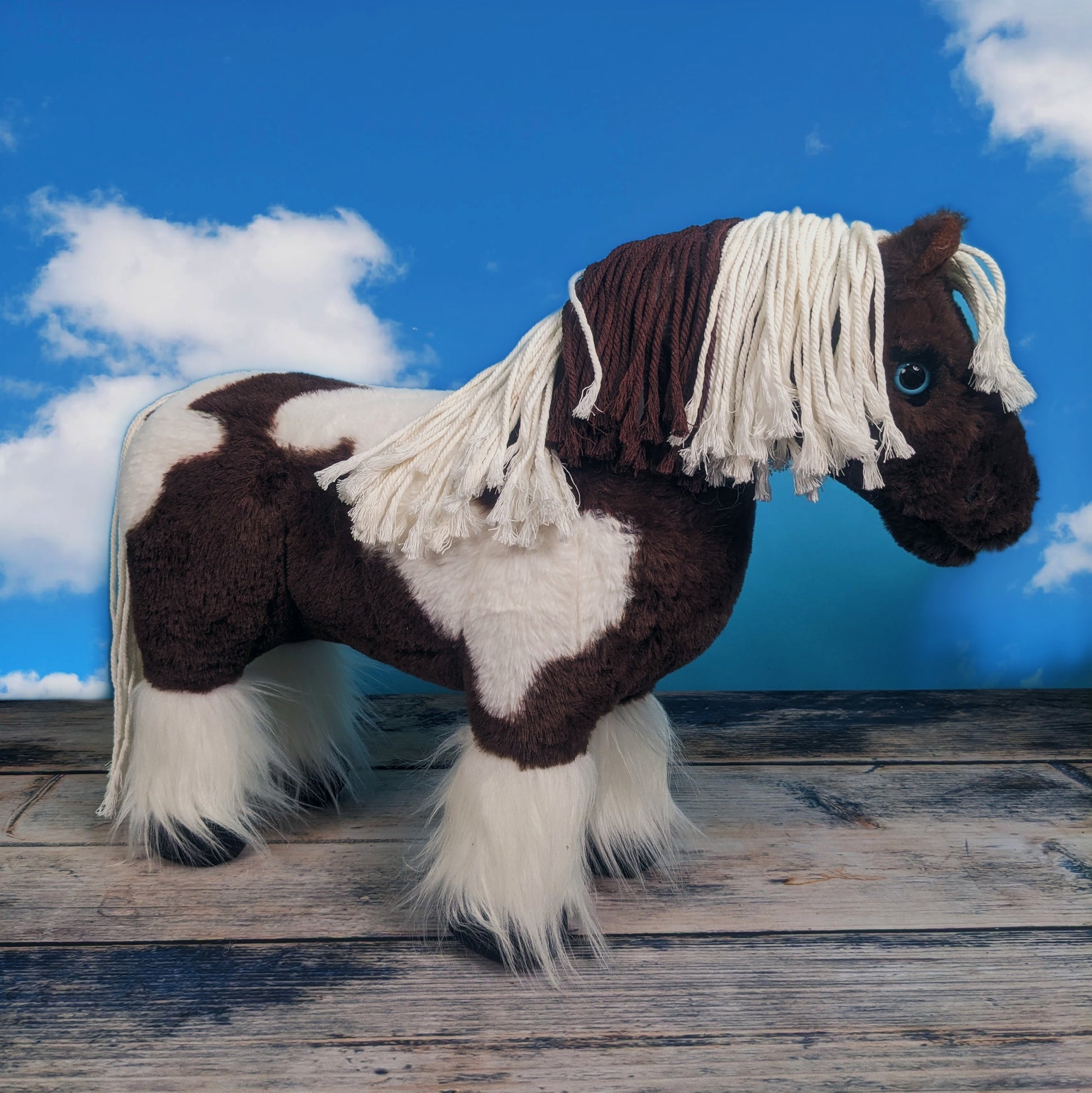Dazzle ist ein wunderschönes braun-weißes Skewbal-Pony mit flauschigen Federn und einer flechtbaren Mähne und Schweif. Sein Fell ist super weich – perfekt zum Bürsten und Pflegen. Er steht sicher auf allen vier Beinen und ist flexibel, sodass er auch für kleine Kinder (ab 3 Jahren) sicher zum Spielen ist.