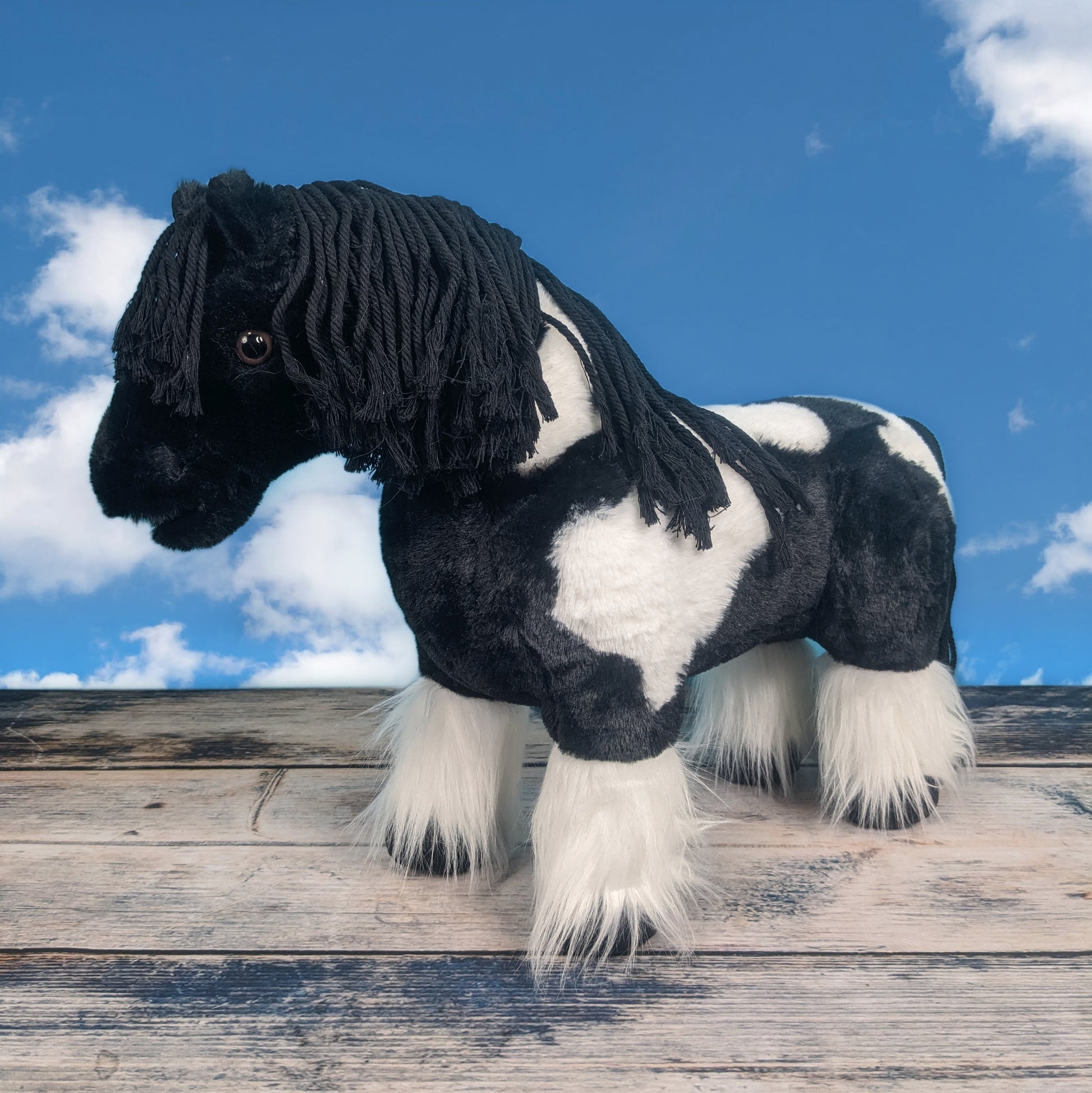 Razzle ist ein wunderschönes schwarz-weiß gechecktes Pony mit flauschigen Federn und einer flechtbaren Mähne und Schweif. Sein Fell ist super weich – perfekt zum Bürsten und Pflegen.
