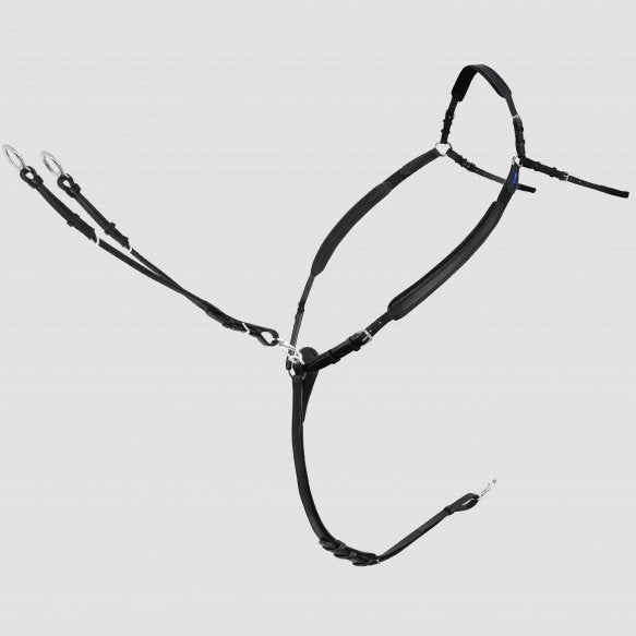 Das weich unterfütterte PASSIERBLU Easy Vorderzeug hat eine lange Brücke über den Widerrist. Die Seitenteile lassen sich mit einer Lasche an den Sattelstrippen befestigen. Die Martingalgabel ist in der Länge verstellbar und abnehmbar. Die Bauchstrippe lässt sich einfach mit ihrem Karabinerhaken am Sattelgurt befestigen.